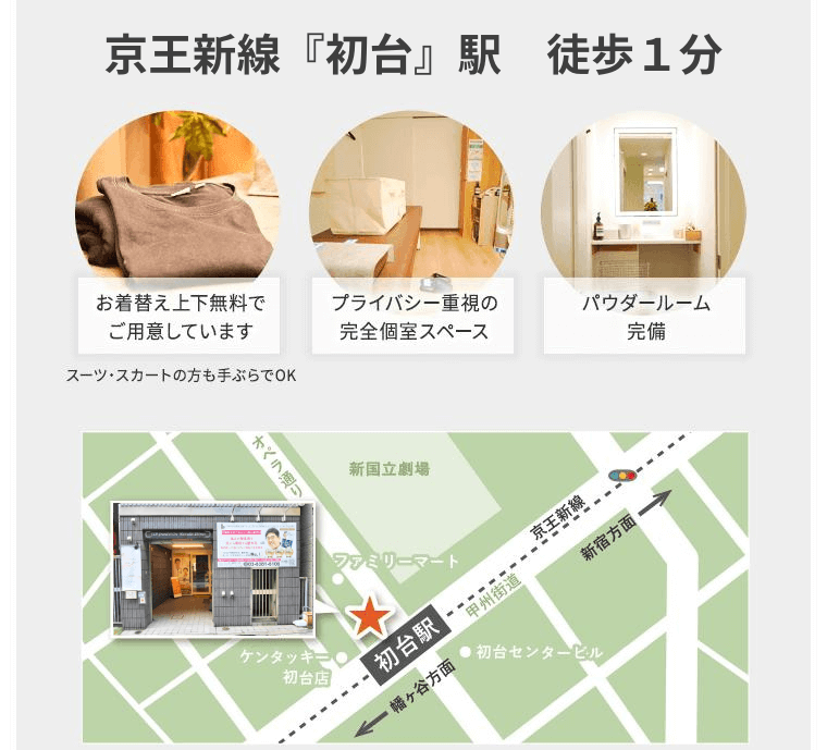 京王線初台駅から徒歩1分の好立地にございます。新国立劇場の隣の1Fに当院がありますので、目印にしてご来院くださいませ。