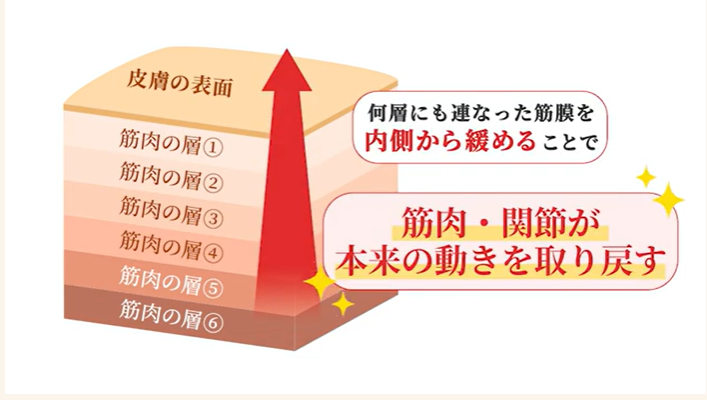 何層にも重なった深層筋膜の癒着(コリのようなイメージ)を 内側から緩めてとかし、筋肉や関節の動きを本来のものへと導きます。